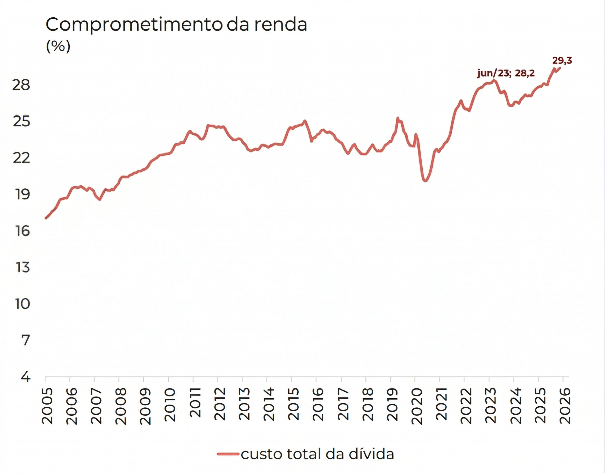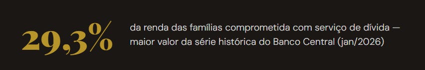 Para onde está indo o dinheiro, então? Para pagar dívidas. O comprometimento de renda das famílias com o serviço da dívida bateu recorde na série do Banco Central: 29,3% em janeiro de 2026. Isso significa que, de cada R$ 100 que uma família brasileira ganha, quase R$ 30 vão direto para juros e amortizações.
