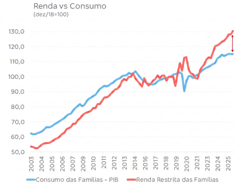 Há uma consequência em estimular a renda via crédito. A renda das famílias continuou subindo, mas o consumo parou de acompanhar. A renda disponível das famílias cresceu cerca de 4,8% em termos reais em 2025, enquanto o consumo no PIB avançou apenas 1,3%. No quarto trimestre do mesmo ano, o consumo cravou zero de crescimento.
