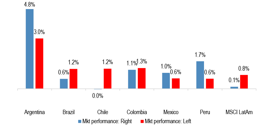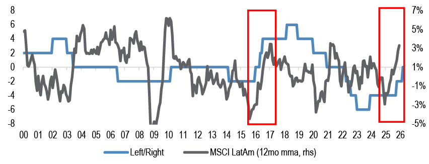 Embora o índice MSCI LatAm apresente, historicamente, uma média de retorno mensal ligeiramente superior sob governos de esquerda (0,8% contra 0,1% da direita), a grande oportunidade reside no momento da virada. O JP Morgan destaca que os ralis mais fortes acontecem justamente quando o espectro está mudando para a direita.