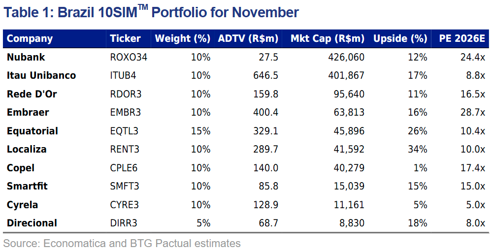 O impacto positivo da queda da taxa Selic no Brasil sobre os lucros das empresas e a atividade econômica deve sustentar as ações locais. Com este cenário em mente, o BTG Pactual realizou ajustes na sua carteira mensal de 10 ideias de ações para o mês (10SIM) de novembro, adicionando risco e realocando em utilities.