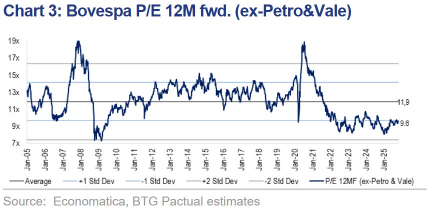 Apesar do recente rali, as ações brasileiras permanecem baratas. O mercado está sendo negociado a 9,6x o P/E (Preço/Lucro) projetado para os próximos 12 meses (excluindo Petrobras e Vale), um desvio-padrão abaixo da média histórica de 11,9x.