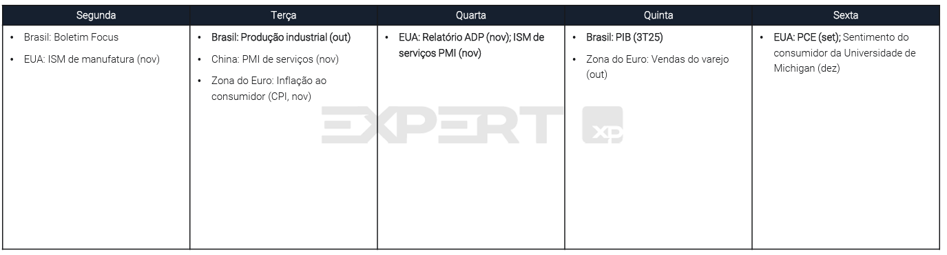 Na terça-feira (2), o mercado brasileiro recebe a produção industrial de outubro, enquanto a Zona do Euro divulga sua prévia de inflação e a taxa de desemprego. Na quarta-feira (3), os EUA publicam os dados de emprego privado da ADP e números atualizados da produção industrial.