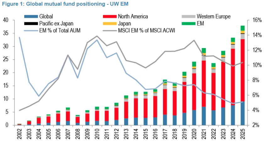 O banco lembra que dos US$ 37,9 trilhões sob gestão global, apenas 5,1% está hoje aplicado em ações de mercados emergentes. A média histórica é de 6,4% e a alocação neutra seria de 10,4%.