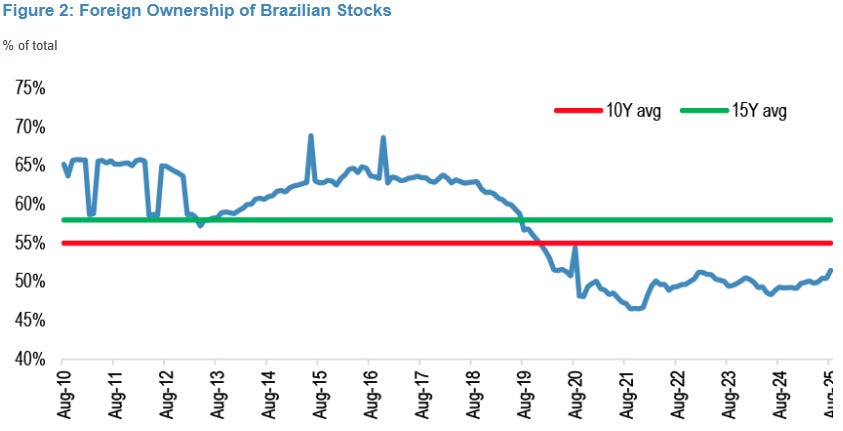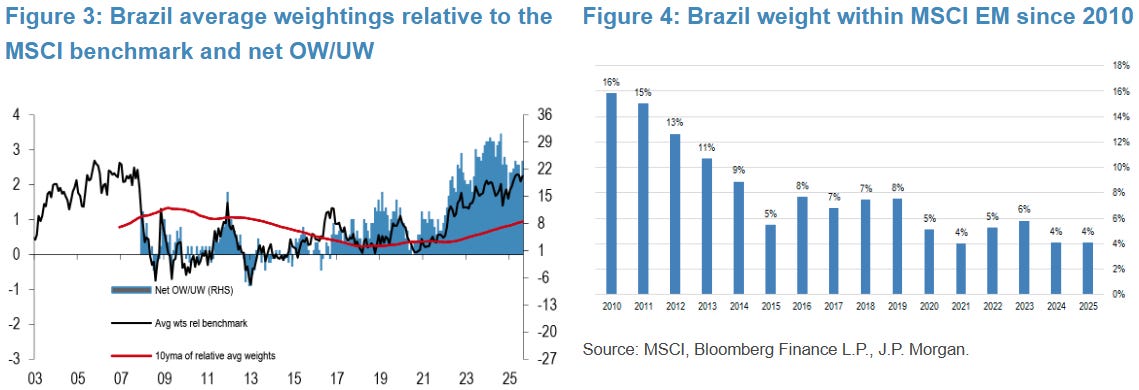 O relatório também analisou dados da EPFR, que monitora 56 fundos de mercados emergentes com US$ 1,1 trilhão em ativos sob gestão. Do total, 24 fundos estão sobreponderados (overweight) em Brasil, proporção 25% menor que o pico observado em outubro de 2024.