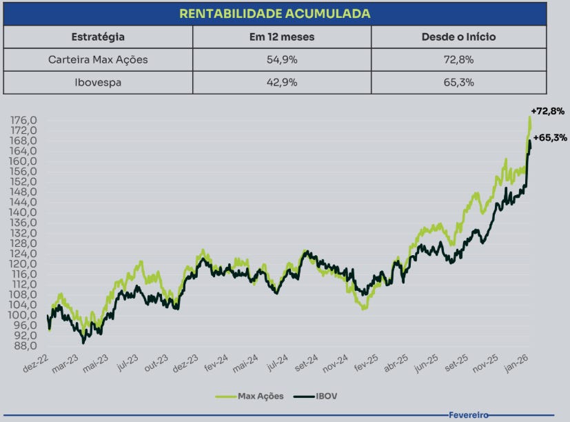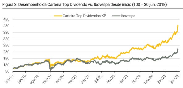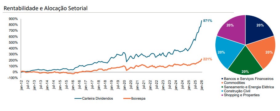 Mantendo o rigor na escolha de empresas maduras com gestão de excelência, a carteira prioriza papéis que garantam um fluxo recorrente de proventos e apresentem resiliência operacional. Os resultados recentes comprovam o sucesso dessa tese, com a carteira registrando alta de 13,8% em janeiro de 2026, superando os 12,6% do Ibovespa. No histórico de longo prazo, a estratégia acumula uma rentabilidade de 328,7%, mais que o dobro dos 149,3% do índice de referência, reforçando sua eficiência como uma alternativa defensiva e rentável para o investidor focado em dividendos.