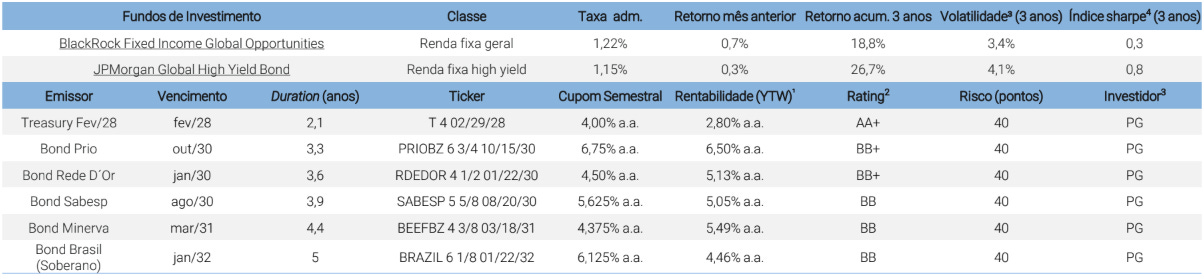 Já nos Prefixados, a exposição permanece acima do nível neutro, com a duration elevada de três para quatro anos neste mês. A aposta baseia-se no potencial de fechamento dos juros futuros, sustentada pela melhora na inflação corrente e um câmbio mais estável. Embora o cenário fiscal ainda gere prêmios de risco nos vértices mais longos, a XP identifica uma oportunidade tática nos vencimentos médios, onde a convergência das expectativas de inflação pode favorecer a valorização dos papéis.
