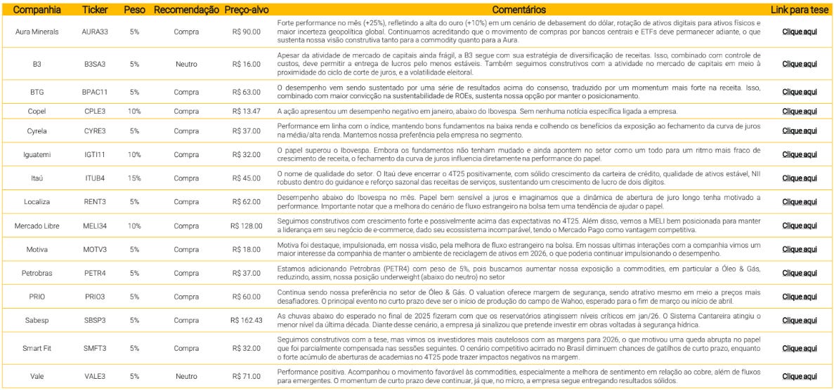 A carteira ampliou a exposição ao setor financeiro. A Stone entrou com peso de 5%, apoiada em valuation considerado atrativo e na expectativa de pagamento relevante de dividendos após a venda da Linx. Os bancos seguem com 25% da carteira, com aumento da participação do Nubank para 15% e redução do Itaú para 10%. A Embraer saiu após forte valorização e foi substituída pela PRIO, que, segundo o BTG, negocia com elevado fluxo de caixa livre projetado para 2026. A Aura foi mantida, preservando a exposição a ativos dolarizados.