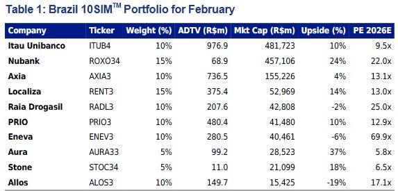 Além de Eneva, Axia, Localiza, Nubank, Itaú, Stone, PRIO, Aura, Allos e Raia Drogasil, o banco destaca que a composição segue equilibrada entre setores domésticos, exportadores e empresas com geração recorrente de caixa, em um cenário ainda sustentado pelo fluxo de investidores estrangeiros.