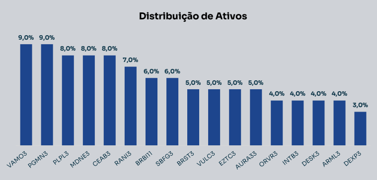A casa realizou uma reformulação relevante, destacando-se a saída da Metalúrgica Gerdau [GOAU4] (-5%) para a entrada da Moura Dubeux [MDNE3] (+6%). O gestor também promoveu ajustes finos para reequilibrar o risco, com reduções de 1% em C&A Modas [CEAB3], Localiza [RENT3], Inter & Co [INBR32] e Iguatemi [IGTI11], além de 3% na Plano & Plano [PLPL3], enquanto elevou em 1% a exposição em Caixa Seguridade [CXSE3], Itaúsa [ITSA4], XP Inc [XPBR31] e Azzas 2154 [AZZA3], com aporte adicional de 2% na Axia [AXIA3].