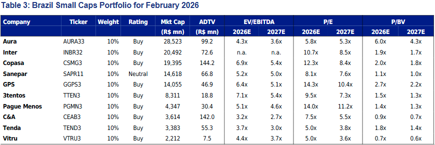 O BTG Pactual atualizou a carteira de Small Caps para fevereiro com a inclusão de Vitru [#VTRU3] e C&A [#CEAB3]. Segundo o banco, as mudanças buscam capturar oportunidades em empresas com valuation atrativo e gatilhos operacionais, em um cenário ainda marcado por forte fluxo de recursos para ações brasileiras.