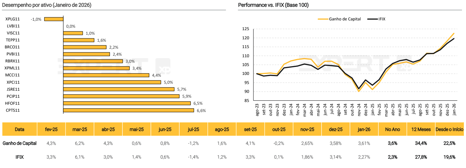 Destinada a investidores de renda variável, a estratégia busca superar o IFIX no longo prazo através de uma seleção de 14 ativos. O desempenho recente reforça a tese: em janeiro, a carteira subiu 3,61% contra 2,27% do índice, acumulando alta de 34,4% nos últimos 12 meses. Com um dividend yield anualizado de 10,5%, a composição atual prioriza fundos com perspectivas de melhora na distribuição de rendimentos e preços convidativos.