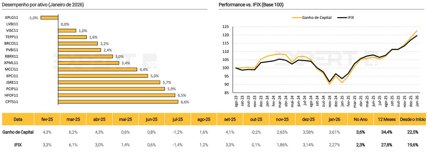 Com perfil moderado, a estratégia busca superar o IMA-B 5+ combinando FIIs, Fiagros e FI-Infras. Em janeiro, a carteira subiu 3,7% frente aos 0,84% do benchmark, gerando um dividend yield anualizado de 12,3%. Os ajustes atuais visam capturar o carrego atraente de recebíveis e o potencial de valorização do setor de escritórios.
