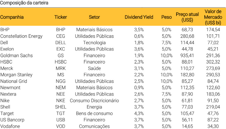 Segundo a XP, o movimento busca maior alinhamento ao benchmark da estratégia, o iShares Select Dividend ETF, que tem maior peso em bancos regionais dos Estados Unidos. A mudança também contribui para elevar o dividend yield total da carteira, atualmente em 2,6%.