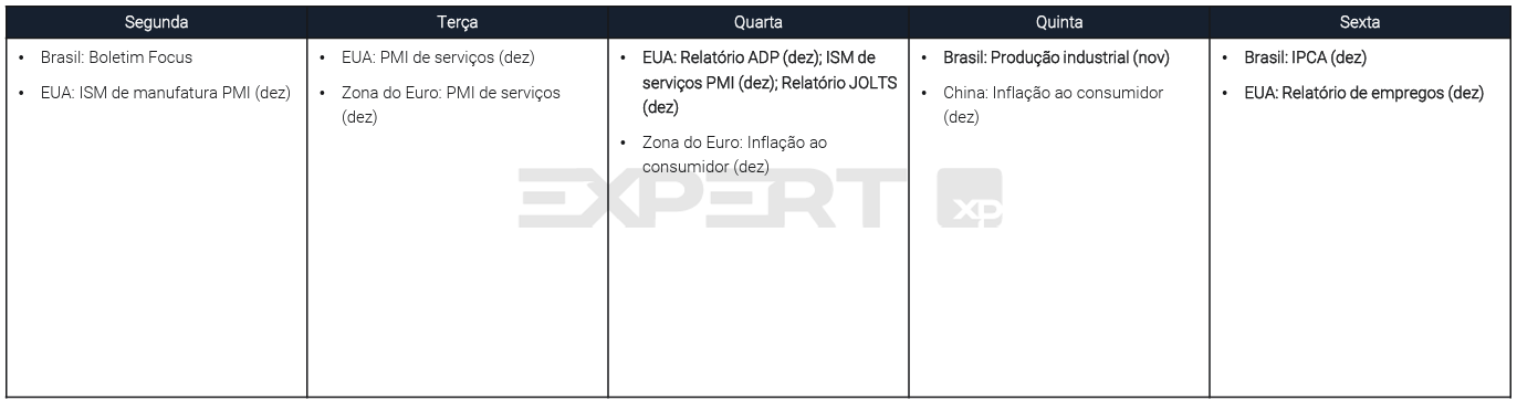 No cenário internacional, a agenda dos Estados Unidos trará os principais indicadores de mercado de trabalho de dezembro, com ênfase ao Payroll e à taxa de desemprego.