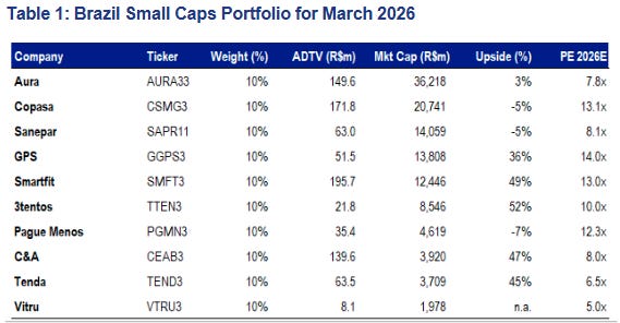 Permanecem na carteira Aura [#AURA33], Copasa [#CSMG3], Sanepar [#SAPR11], GPS [#GGPS3], 3tentos [#TTEN3], Pague Menos [#PGMN3], C&A [#CEAB3], Tenda [#TEND3] e Vitru [#VTRU3].Em contrapartida, Inter [#INBR32] deixou o portfólio.