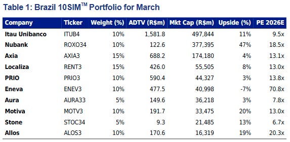 O BTG Pactual atualizou a carteira 10SIM de março após mais um mês de forte entrada de capital estrangeiro e alta do Ibovespa. Segundo o banco, as ações brasileiras negociam próximas da média histórica, o que reforça a busca por papéis com valuation atrativo, liquidez e gatilhos específicos. Em meio ao conflito no Irã, a casa manteve a exposição a petróleo e ouro, por meio de Aura [#AURA33] e PetroRio [#PRIO3].