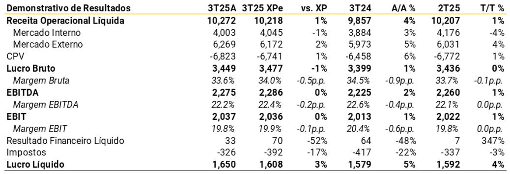 A receita líquida da WEG atingiu R$10,3 bilhões, crescendo apenas +4% A/A, valor que ficou abaixo das projeções tanto do JP Morgan quanto do BTG, que estimava +7% A/A. O BTG ressaltou que, se ajustado por M&As (Fusões e Aquisições), o crescimento foi de apenas +3% A/A. Esta desaceleração na receita é o principal ponto de atenção. O JP Morgan e a XP apontaram que as receitas externas foram o principal vetor negativo, com o JP Morgan indicando que a valorização do Real (BRL) impactou os números em moeda local, embora em dólar o miss tenha sido menor. Além disso, o segmento de GTD (Geração, Transmissão e Distribuição) foi o ponto fraco doméstico, com queda de -7% A/A, devido à redução nas entregas de projetos de geração solar centralizada, um fator de destaque para a XP.