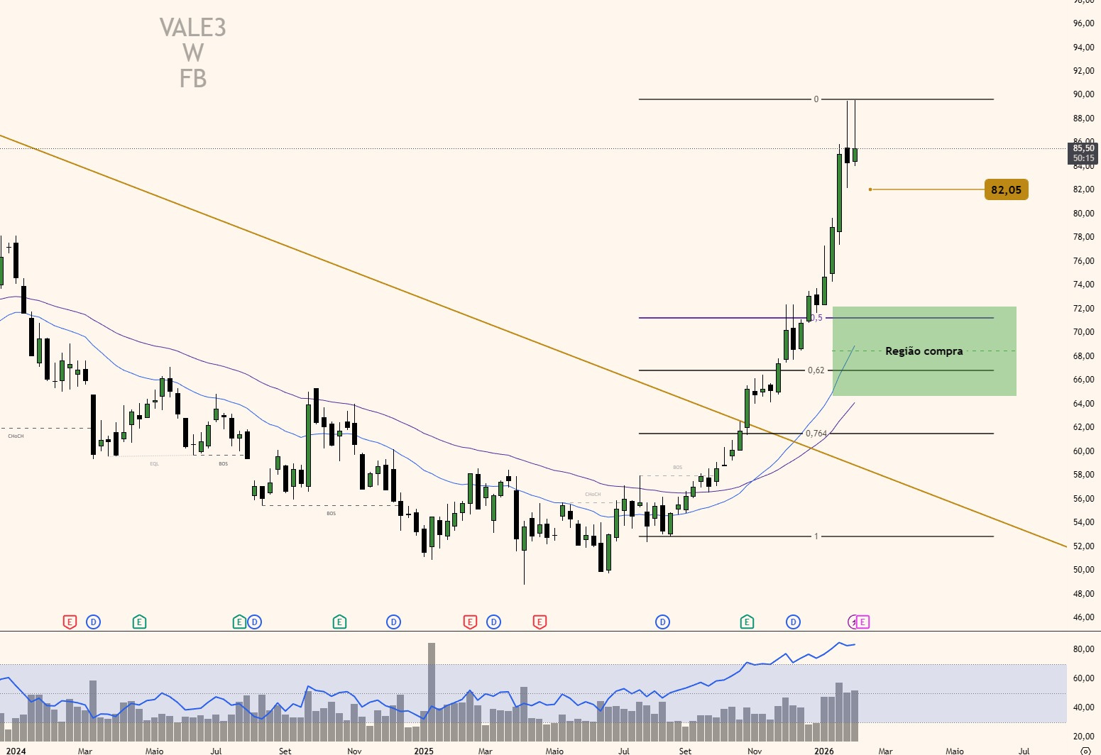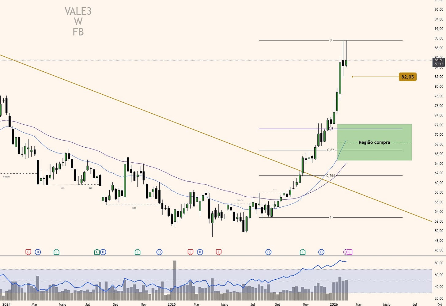 As ações da Vale começam a dar sinais de perda de fôlego após uma forte valorização recente, que levou o papel de cerca de R$ 52,00 para próximo de R$ 90,00. De acordo com Filipe, houve falha no rompimento das máximas nesta semana, apesar do fluxo ainda elevado no ativo. “O movimento mostra um possível cansaço da alta, o que me faz aguardar correções para novas compras”, explica. O analista avalia que, caso o papel perca o patamar de R$ 82,00, pode haver uma queda mais acentuada. “Vejo regiões interessantes de compra entre R$ 71,00 e R$ 65,00”, afirma, recomendando proteção ou realização parcial de lucros para quem já está posicionado.