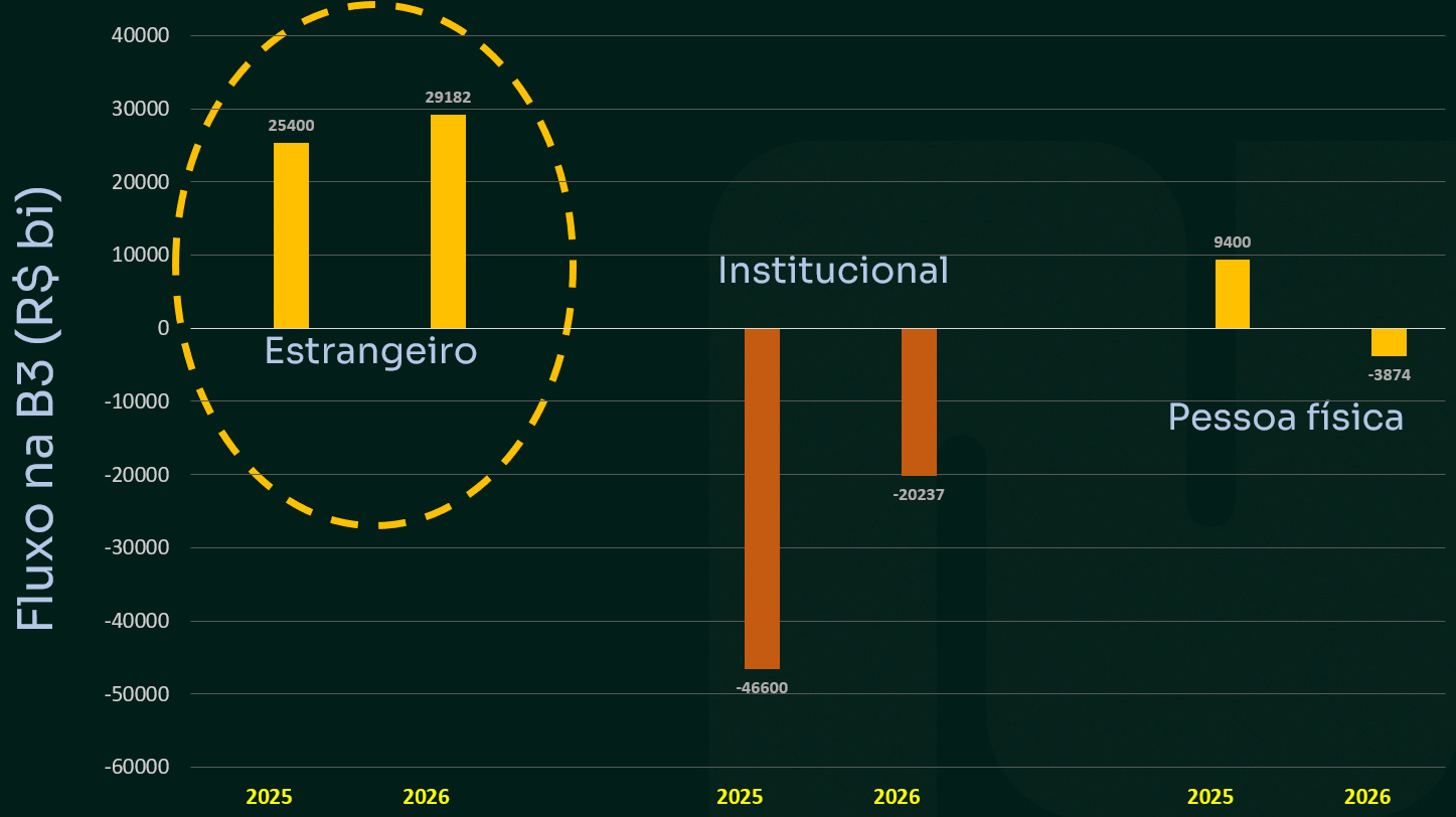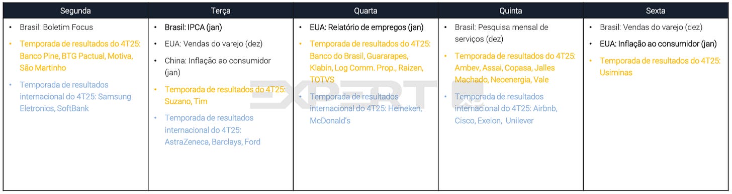 A semana também conta com eventos externos de alto impacto. No Japão, as eleições parlamentares de domingo (8) podem encarecer o financiamento global (carry trade) caso o partido da primeira-ministra Sanae Takaichi conquiste uma supermaioria. Na China, dados de inflação e preços de imóveis servirão de termômetro para a demanda por commodities.