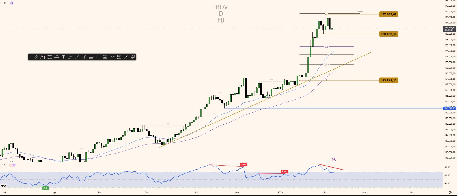 O Ibovespa encerrou a semana próximo da estabilidade, após dias de forte volatilidade, alternando altas e quedas e fechando em torno dos 182.000 pontos. Segundo Filipe Borges, analista técnico da NMS Research, indicadores técnicos já acendem um sinal de atenção no curto prazo. “O IFR mostra uma divergência baixista, com o índice renovando topo sem confirmação do indicador”, afirma. Para ele, esse comportamento aumenta a probabilidade de lateralização ou de uma correção pontual em parte dos ativos. “Abaixo dos 180.000 pontos, vejo espaço para uma correção mais ampla, com regiões entre 175.000 e 173.000 pontos”, diz Borges, ressaltando que um eventual ajuste seria saudável após a alta contínua desde a faixa dos 163.000 pontos.