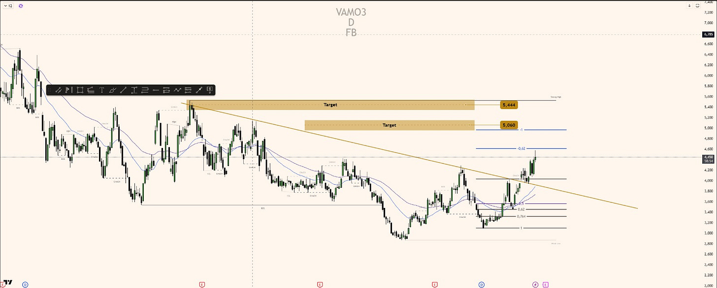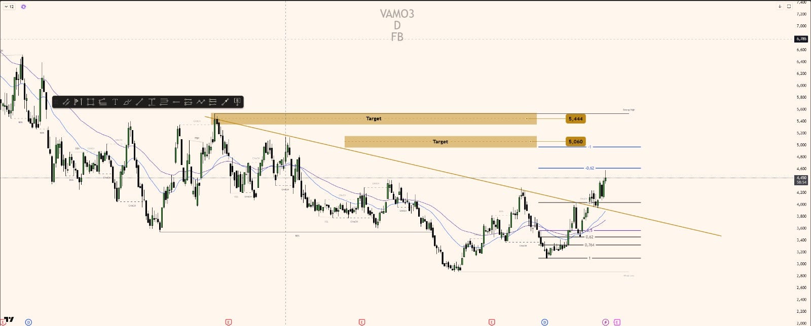 A Vamos segue como uma das apostas da NMS Research no curto prazo, com posição comprada na faixa de R$ 4,31 em operações de swing trade. Segundo Filipe Borges, o ativo apresenta uma estrutura técnica favorável após o rompimento de uma linha de tendência relevante. “O rompimento de R$ 4,60 abre espaço para movimentos mais fortes de alta”, diz o analista. Ele projeta como próximos objetivos a região de R$ 5,05 e, posteriormente, R$ 5,45 por ação. “Seguimos na ponta compradora, atentos a novas oportunidades dentro dessa movimentação”, acrescenta.