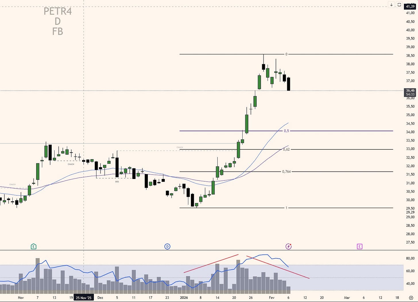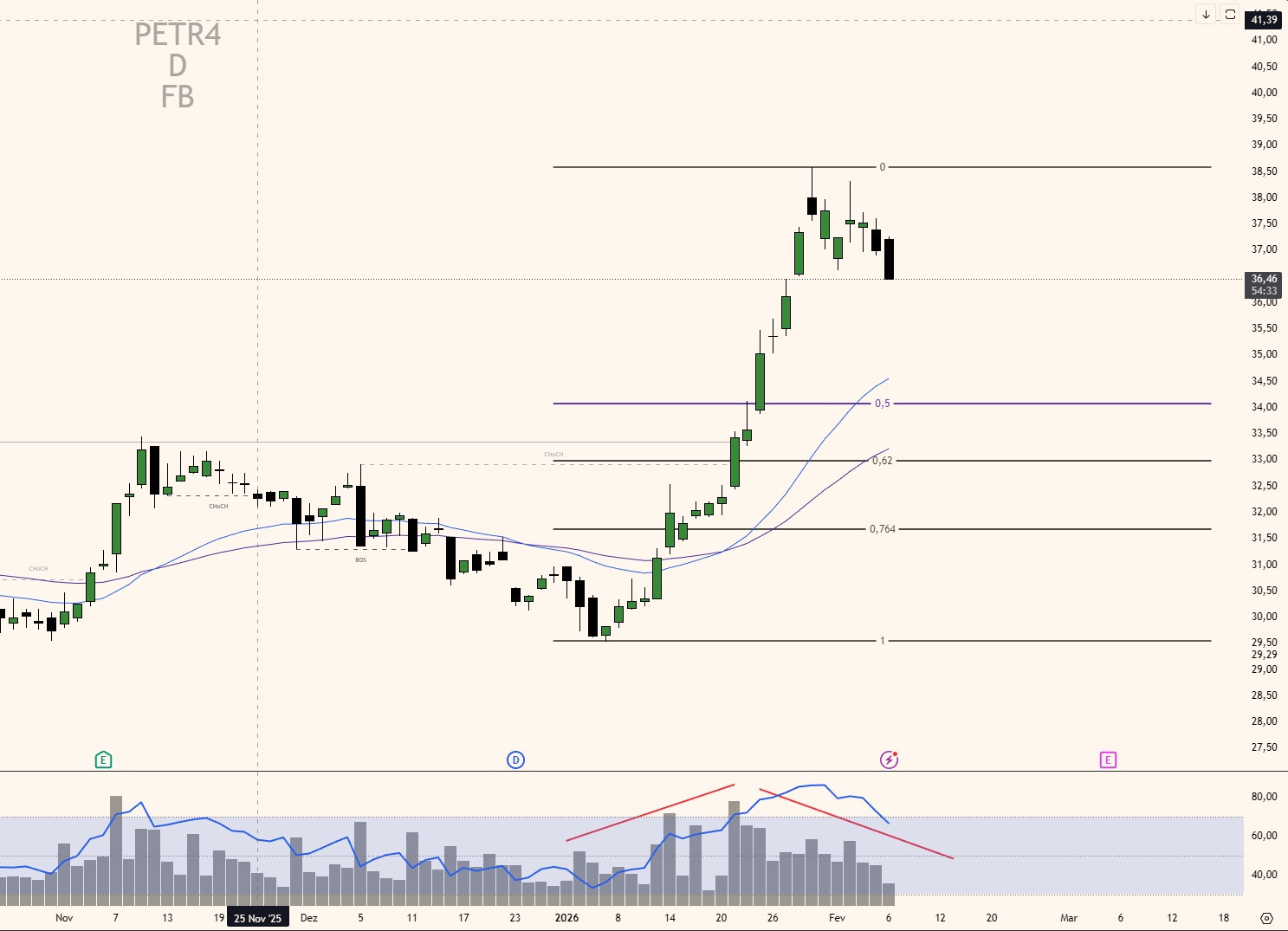 Após uma alta expressiva, que levou as ações da Petrobras de R$ 29,50 para R$ 38,50, o papel iniciou um movimento corretivo considerado natural. Borges destaca que o comportamento do volume reforça essa leitura. “Tivemos aumento de volume na alta e redução durante a correção, o que é bastante saudável”, avalia. O analista projeta uma possível zona de oportunidade entre R$ 34,00 e R$ 32,00. “Nessa faixa, passo a avaliar novas compras, pensando inclusive em posições de mais longo prazo”, afirma, destacando que, antes disso, o papel ainda pode ser explorado em operações na ponta vendedora até os níveis mais baixos dessa região.