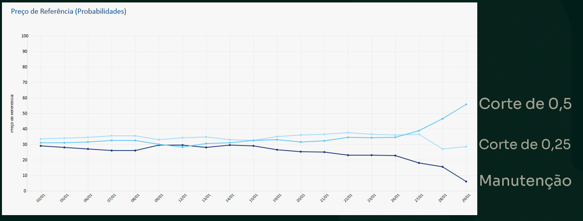 No Brasil, o Banco Central manteve a taxa Selic em 15,0% na última reunião. Segundo o Santander, a comunicação da decisão sinalizou que, caso o cenário esperado se confirme, o ciclo de cortes de juros pode começar já na reunião de março.