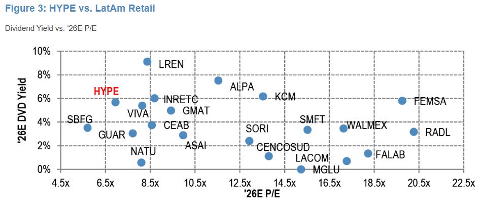 No varejo, a Hypera está entre as cinco maiores pagadoras de dividendos, combinando um dos menores P/L do grupo, o que reforça seu perfil de resiliência e geração de caixa em meio a um cenário de juros ainda elevados.