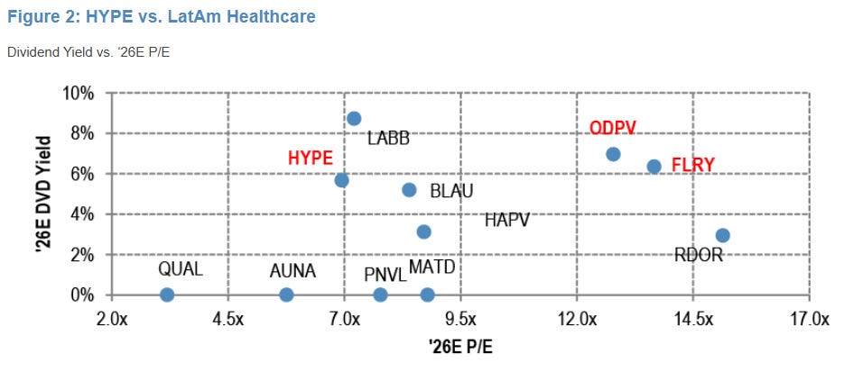 Com dividend yield de 6%, a Hypera é hoje a principal pagadora de dividendos entre as empresas cobertas pelo JP Morgan. No universo latino-americano, apenas a Genomma Lab, do México, oferece um retorno maior (10%), mas com desafios mais severos de crescimento. Entre as brasileiras, a OdontoPrev distribui dividendos superiores, porém com múltiplos mais caros e menor avanço de lucro.