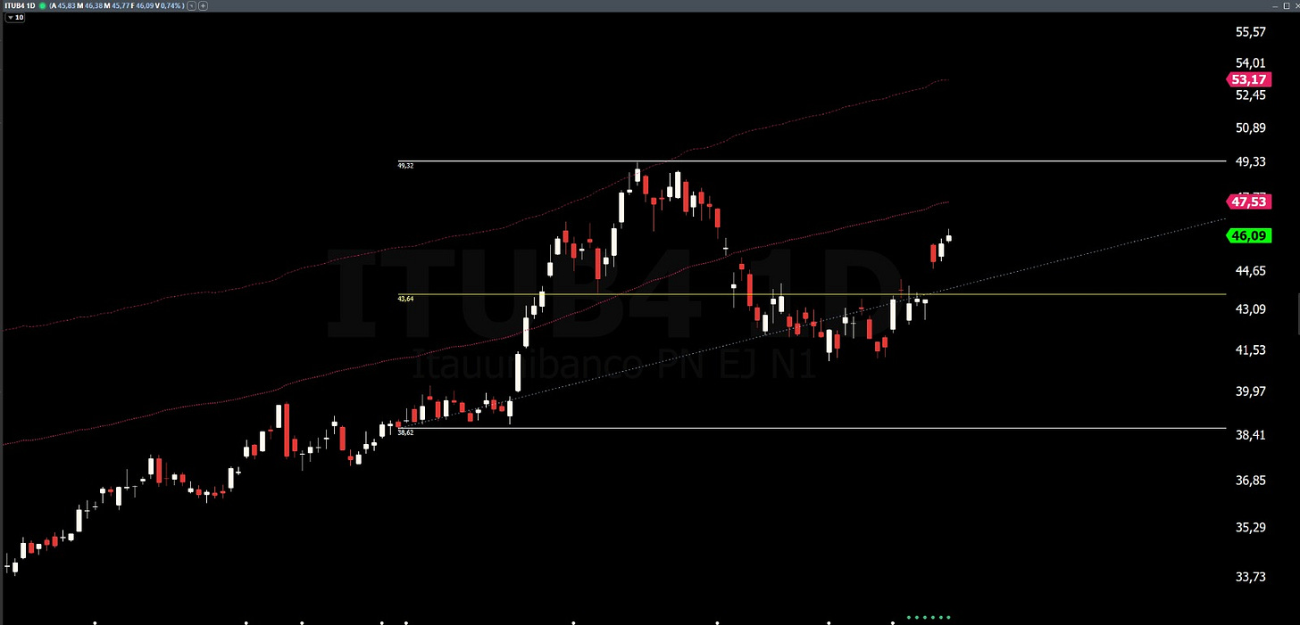 O Itaú Unibanco segue em tendência de alta após o alívio recente no cenário externo, sustentando-se próximo das máximas em torno de R$ 46,35. Borges projeta continuidade do movimento. “O próximo alvo está em R$ 49,15, com suporte relevante abaixo de R$ 42,13”, afirma. Ele destaca que o setor bancário pode se beneficiar de medidas em discussão pelo governo. “A liberação do FGTS para quitação de dívidas tende a reduzir a inadimplência, o que melhora os resultados dos bancos e favorece a valorização das ações”, diz.