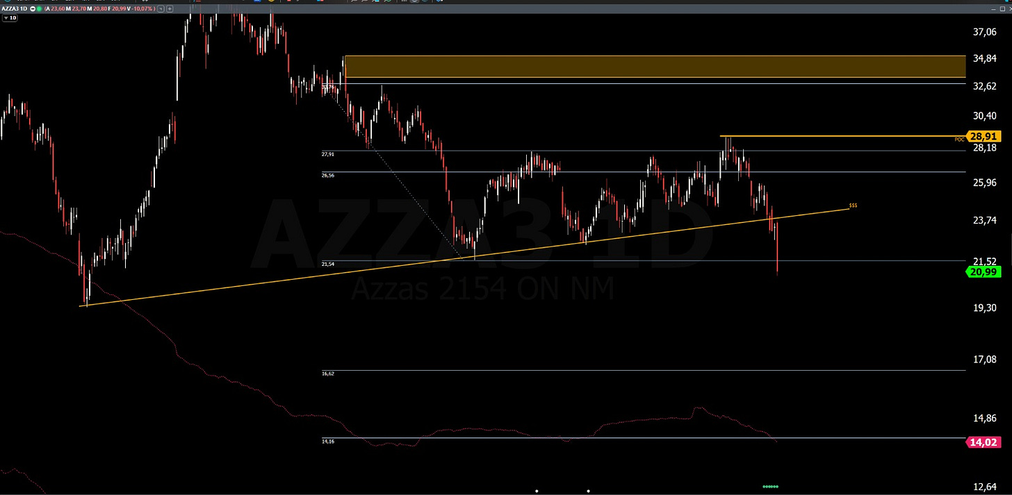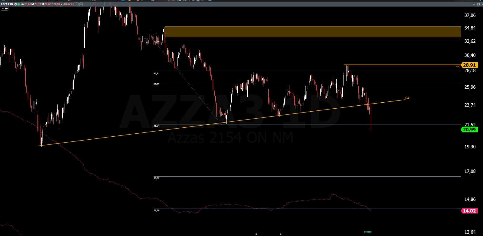 As ações da Azzas intensificaram o movimento de queda e registraram recuo de cerca de 10% na sessão, com rompimento de mínimas recentes. Borges aponta que o ativo segue pressionado no curto prazo. “O próximo alvo está em R$ 19,26, mas o movimento principal pode levar o papel para a faixa entre R$ 16,60 e R$ 14”, afirma. Para o analista, o cenário ainda não indica reversão. “Não vejo ponto de compra no momento. Para quem está vendido, a recomendação é manter a posição diante da probabilidade de novas quedas”, acrescenta.
