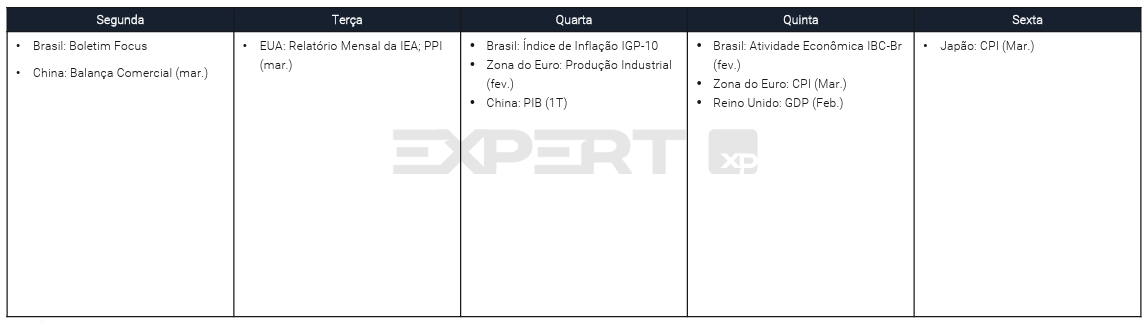 A semana traz dados relevantes de atividade na China: PIB do 1º trimestre, produção industrial, vendas varejistas e desemprego de março. Na Europa, saem o CPI da Zona do Euro (março) e o PIB do Reino Unido (fevereiro). Nos EUA, destaque para o PPI de março e o relatório mensal da IEA.