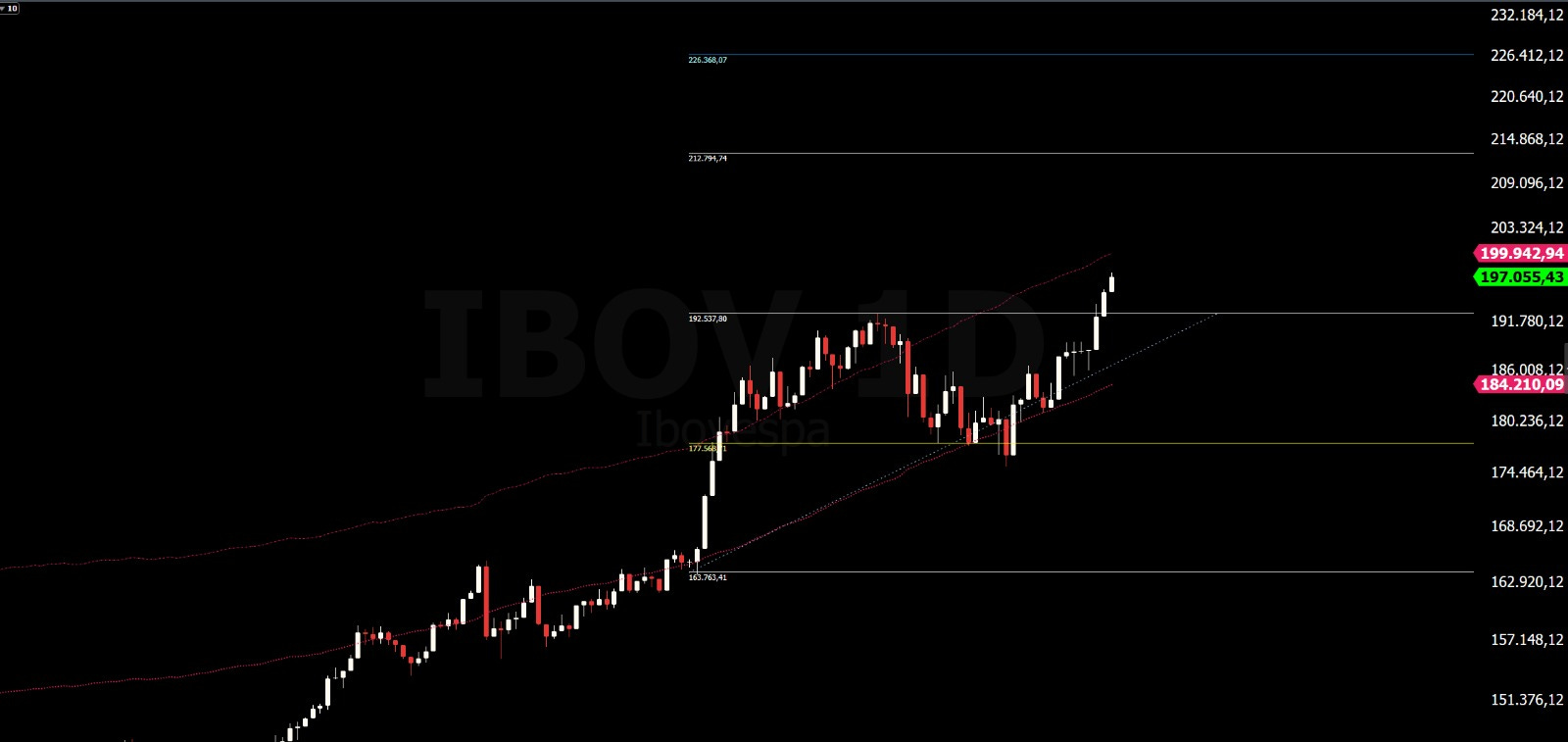O Ibovespa mantém trajetória de alta e renovou máximas históricas ao longo da semana, operando próximo dos 197 mil pontos e se aproximando do patamar de 200 mil pontos. Segundo Filipe Borges, analista técnico da NMS Research, o movimento ainda pode se estender. “Vejo espaço para o índice buscar entre 205 mil e 210 mil pontos”, afirma. Ele pondera, no entanto, que a região dos 200 mil pontos pode funcionar como resistência de curto prazo. “Esse nível tem um peso mais psicológico do que técnico, com investidores aguardando para realizar lucros”, diz. O suporte mais relevante, de acordo com o analista, está em 180,6 mil pontos.