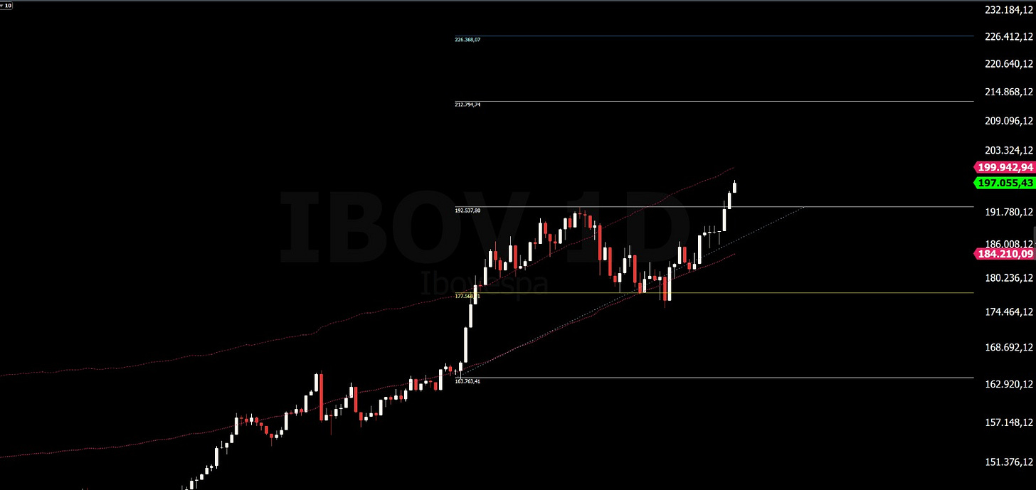 O Ibovespa encerrou a semana em alta de 4,9% em reais e 7,8% em dólares, fechando aos 197.325 pontos, renovando máximas históricas e se aproximando da marca de 200.000 pontos.