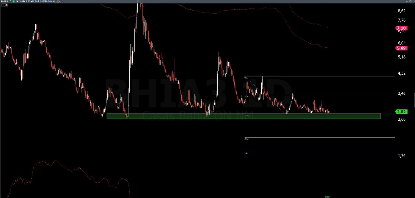 Já os papéis da Casas Bahia apresentam sinais de fraqueza, com formação de topos descendentes e perda de força compradora. Segundo Borges, o ativo pode entrar em um ciclo mais acentuado de queda. “Os compradores não conseguem mais sustentar o preço, e o fluxo vem diminuindo”, afirma. Ele alerta para o rompimento de suporte em R$ 2,65. “Abaixo desse nível, o papel pode buscar entre R$ 1,80 e R$ 1,20”, diz. O analista recomenda cautela aos investidores. “Para quem está posicionado, faz sentido avaliar a saída e migrar para ativos com melhor tendência no curto prazo”, conclui.