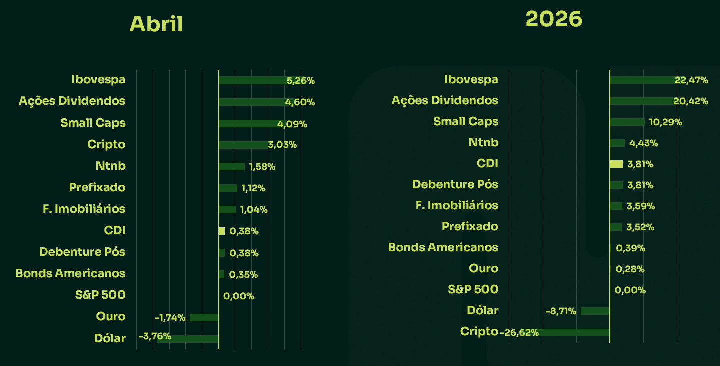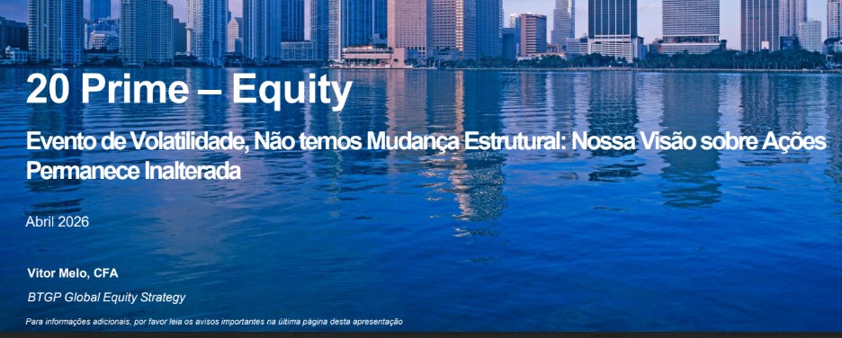 A guerra não foi um percalço no fluxo estrangeiro. Em março ainda registramos fluxo positivo, ainda que em menor intensidade. Com o cessar-fogo, a lógica que vinha sendo construída vai ganhar impulso. Os analistas internacionais voltaram a olhar para o Brasil. O resultado aparece no câmbio antes da bolsa, justamente porque a exposição ao petróleo no Ibovespa amortece o rali relativo dos índices de renda variável.