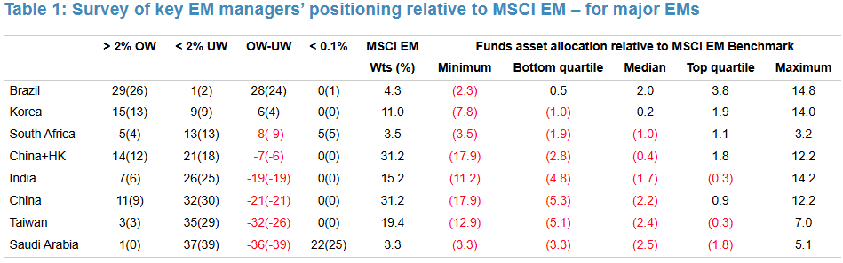 O Brasil, o México e a Coreia são, atualmente, os únicos mercados com excesso de peso consensual entre os gestores avaliados.