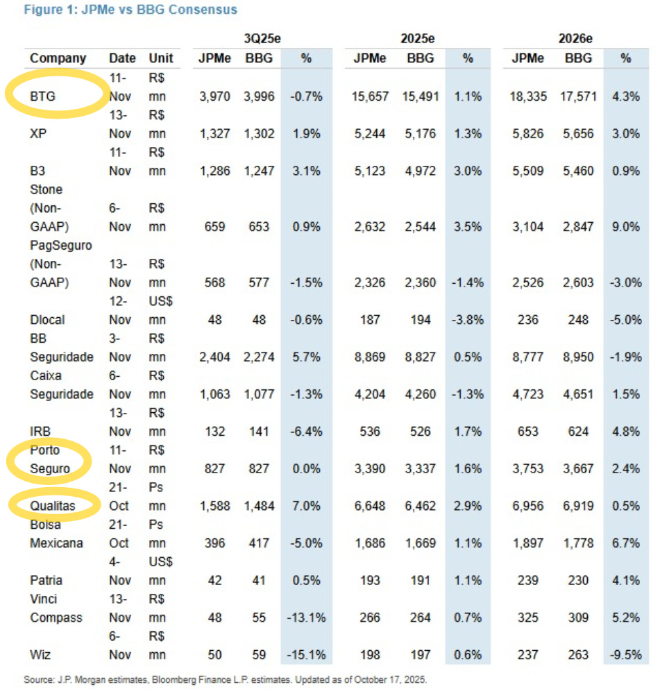 O JP Morgan destacou BTG Pactual [#BPAC11], Porto Seguro [#PSSA3] e Qualitas como suas principais recomendações entre os “não-bancos” da América Latina para os resultados do terceiro trimestre de 2025. O banco prevê desempenho mais fraco nos segmentos de ações e derivativos da B3 e um trimestre sem surpresas para a XP [#XPBR31], embora o baixo nível de expectativas possa abrir espaço para reação positiva.