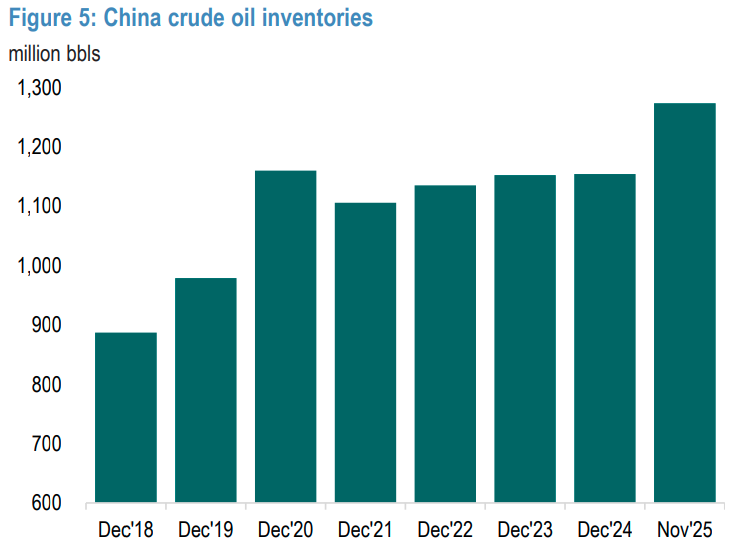 A China foi a principal absorvedora do excesso global de petróleo em 2025, com 114 milhões de barris adicionados aos estoques — incluindo petróleo em trânsito (“oil on water”).