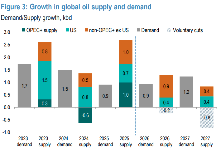 Segundo o banco, não é a demanda que está enfraquecendo, pelo contrário, ela segue resiliente, mas sim a velocidade e a intensidade do crescimento da oferta, especialmente de produtores fora da Opep+, que devem inundar o mercado com barris de baixo custo e alta previsibilidade.