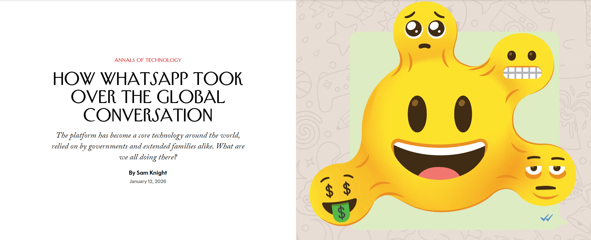 O que começou como uma tentativa frustrada de Jan Koum para mostrar se os amigos estavam "na academia" ou "dormindo" transformou-se na ferramenta de comunicação mais poderosa do planeta. Hoje, com mais de 3 bilhões de usuários, o WhatsApp não é apenas um app de mensagens; em países como Brasil, Índia e Quênia, ele é descrito como uma "tecnologia de vida", servindo para coordenar desde governos nacionais até compras de supermercado e socorro em desastres. A reportagem revela que a simplicidade do app — sem anúncios (até recentemente), sem jogos e focado na identidade real do usuário — foi o que permitiu que ele superasse o SMS e se tornasse o padrão global.