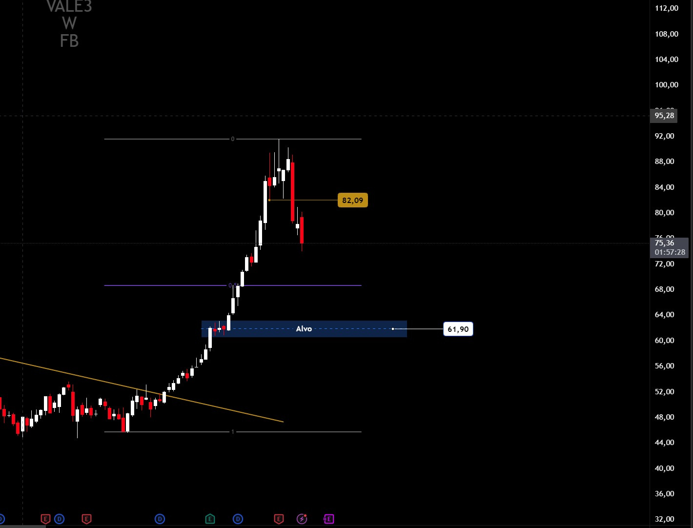 No radar das ações individuais, a Vale (VALE3) segue o mesmo caminho. Borges já havia alertado anteriormente sobre a importância de se observar o rompimento do suporte nos R$ 82,00, nível que acabou cedendo. Desde então, o papel recuou para a faixa dos R$ 75,00, e o analista projeta novas quedas à frente. O próximo alvo técnico da mineradora está na região de R$ 61,90. "Há espaço para a Vale corrigir bem ainda nos próximos dias, em torno de 15% a 17%, e já começamos a observar alguma operação na ponta compradora para quem busca uma entrada", destacou Borges.