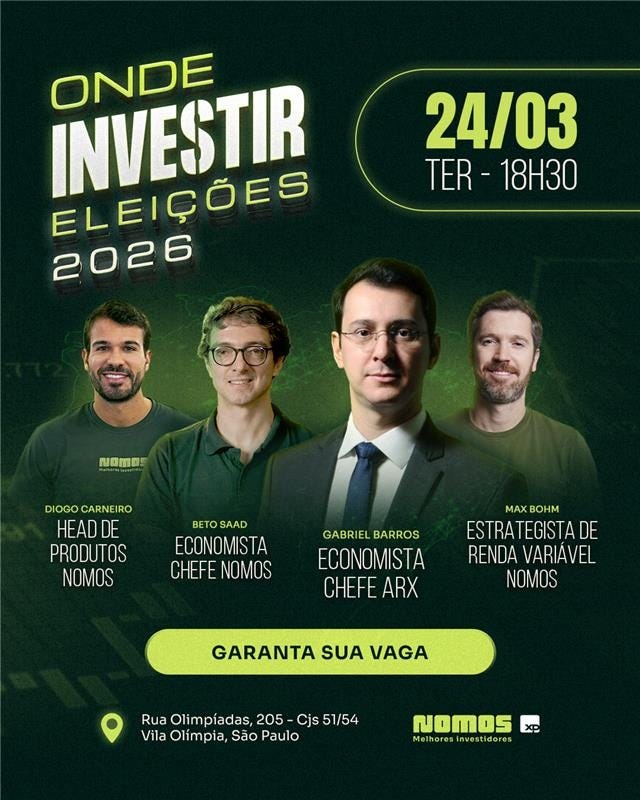 No dia 24/03, às 18h30, vamos realizar a segunda edição do evento “Onde Investir em 2026”.Desta vez receberemos Gabriel Barros, economista-chefe da ARX e ex-diretor do Tesouro Nacional, em um painel junto com três especialistas da Nomos para discutir cenário macro e oportunidades de investimento em 2026 .