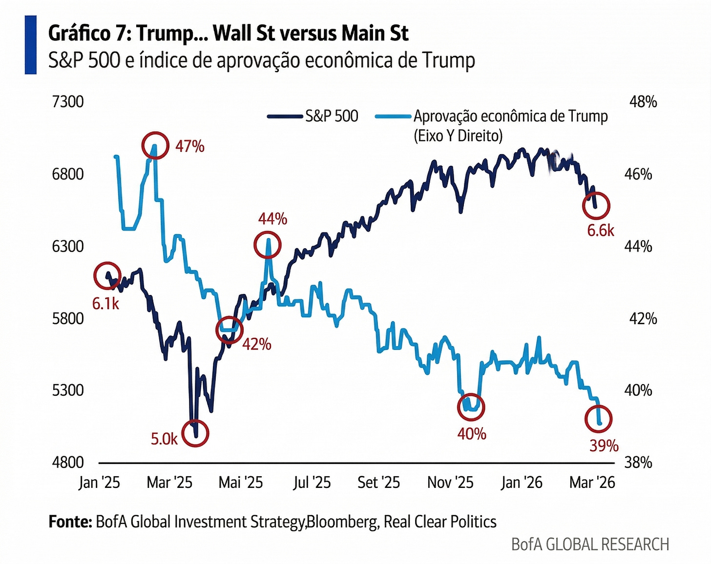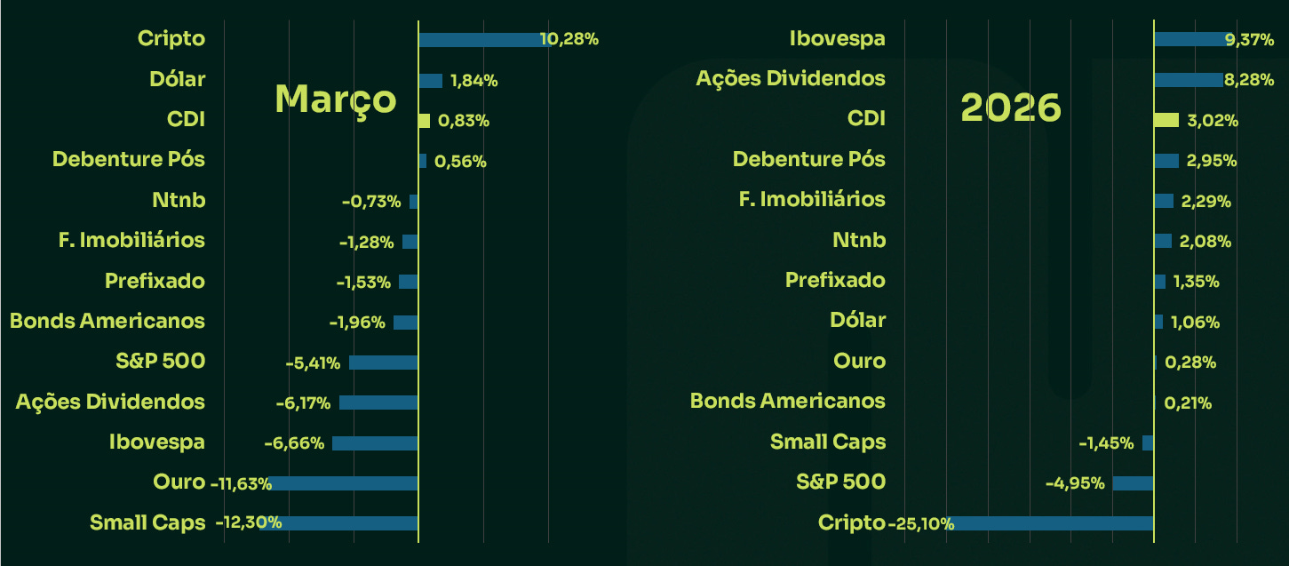 O cenário global segue marcado por maior aversão a risco. A escalada do conflito elevou os preços de energia e ampliou temores de recessão, com queda em metais industriais e mudança na percepção de que a guerra pode ser mais longa e disruptiva para a oferta global.