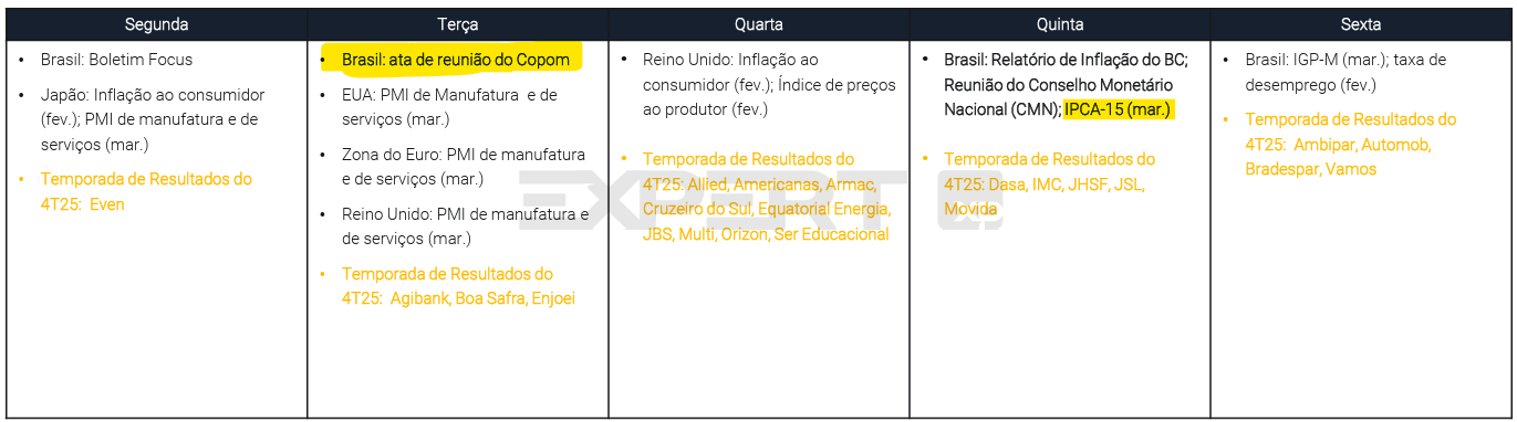 A semana entre 23 e 27 de março deve manter a política monetária no centro das atenções, em meio ao avanço do conflito no Oriente Médio e seus impactos sobre inflação e juros.