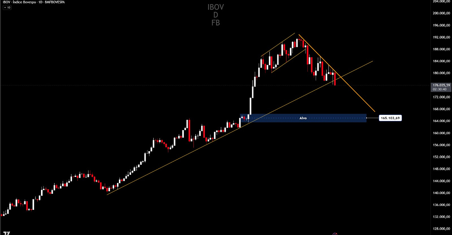 O Ibovespa vive um momento de deterioração técnica relevante. O índice consolidou uma tendência de baixa no gráfico diário, com topos e fundos já confirmados, além de ter rompido uma linha de tendência de alta (LTA) que sustentava o movimento desde outubro do ano passado. Para Filipe Borges, analista técnico da NMS Research, o quadro abre margem para novas perdas nas próximas semanas. "O índice Ibovespa deve buscar a região entre 165 e 166 mil pontos nos próximos dias, o que representa uma queda esperada entre 5% e 7% nas próximas duas semanas", afirmou o analista.