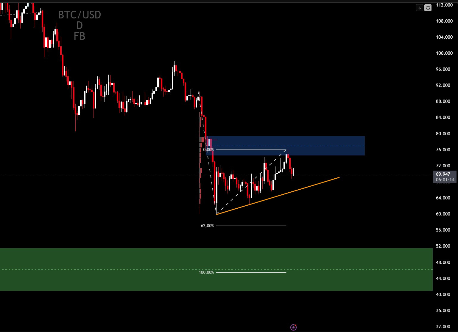 No mercado de criptomoedas, o Bitcoin também enfrenta resistência. O ativo testou uma região de order block, zona de retração relevante, e falhou no rompimento, sinalizando retorno da pressão vendedora. O analista da NMS Research projeta que a criptomoeda deve testar em breve a LTA na faixa dos US$ 66.700. A perda desse suporte, segundo Borges, abriria caminho para quedas mais acentuadas, com primeiro alvo em US$ 56.000. O cenário mais pessimista contempla uma ruptura do suporte dos US$ 60.000 e um movimento em direção aos US$ 45.000.