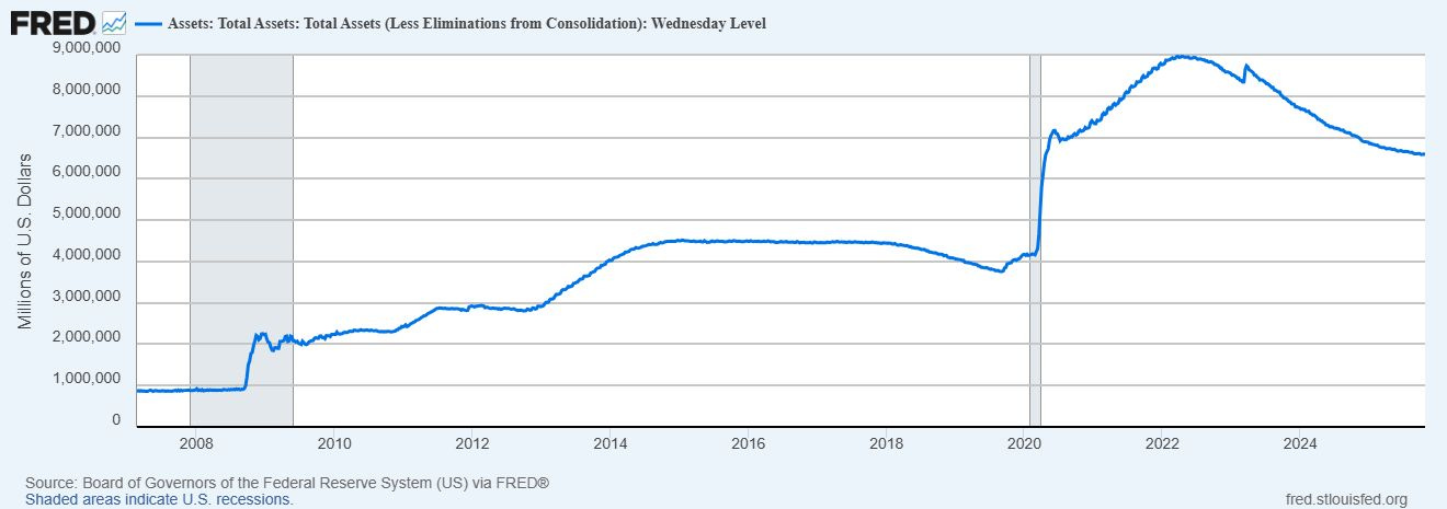 Nos últimos três anos, o Fed vem tentando reduzir esse volume em um processo conhecido como quantitative tightening (QT). Desde então, já conseguiu cortar mais de US$ 2 trilhões, trazendo o estoque de ativos para cerca de US$ 6,6 trilhões. Mas o aperto expôs novamente riscos ao financiamento de curto prazo dos bancos, gerando tensão temporária no sistema.