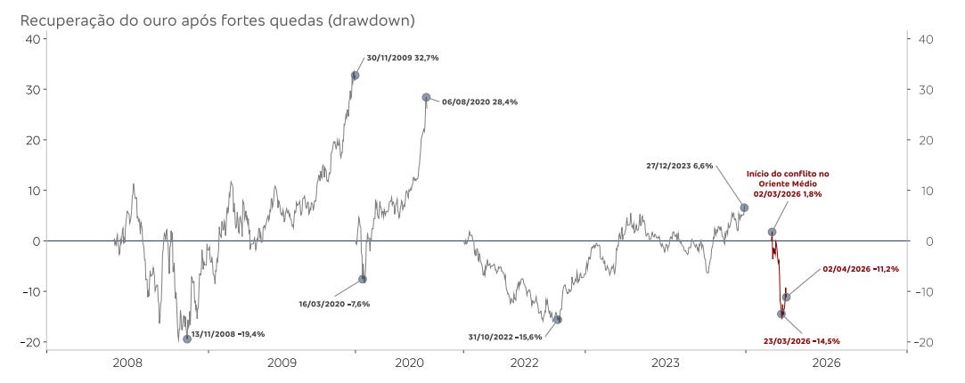 A lógica, em uma linha: quando o Fed voltar a cortar juros de forma mais decisiva, o custo de segurar um ativo sem rendimento cai, e o ouro tende a brilhar exatamente nessa fase do ciclo.