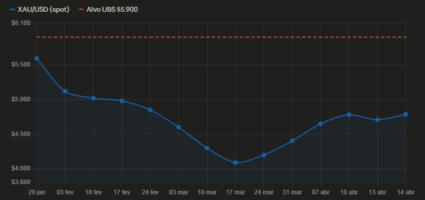O ouro enfrenta um momento de pressão. Depois de bater recorde intradiário de US$ 5.594 por onça em 29 de janeiro, o metal chegou a cair para US$ 4.403 apenas dois pregões depois, e hoje opera em torno de US$ 4.707, ou seja, cerca de 13% abaixo do pico histórico de janeiro. Ainda assim, sobe quase 9% no acumulado de 2026, e o banco suíço UBS aposta que o rali tem fôlego para continuar.